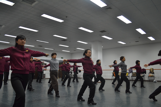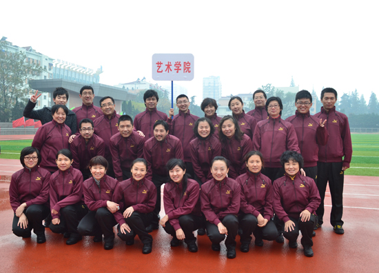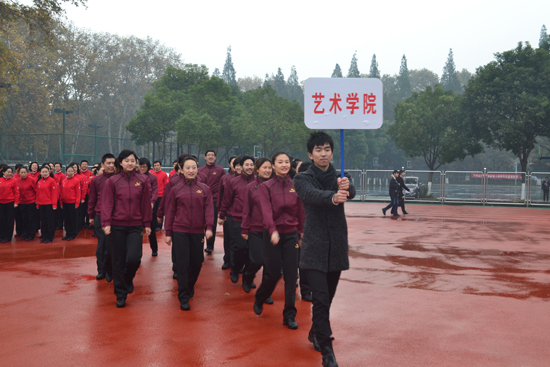 来自各系、机关的老师们还在紧锣密鼓的进行着最后的赛前训练。扬声器里播放着第九套广播体操熟悉的旋律,音乐表演专业的两名同学为老师们进行队列的协调和分解动作的演示。老师们也都非常配合的一遍一遍完善自己的每个动作。