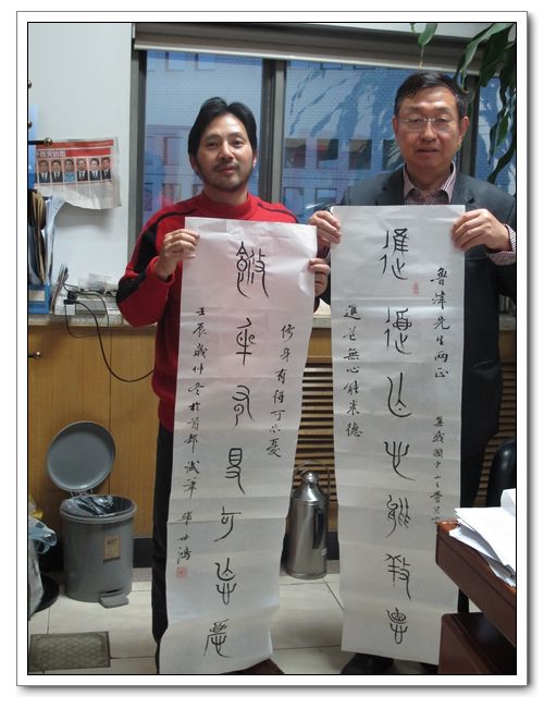 21日,邱世鸿受首都图书馆馆长倪晓建馆长、方文大主任之邀请,文森文化公司刘辉开车接送邱世鸿教授到首图进行考察、交流,参观了其书画藏品馆和图书阅览部,办理了读借卡,并在古藉部举办了笔会,为图书馆及领导书写了作品和题写斋名。倪馆长回赠了新出馆藏精品画集一册和端砚一方。并约下年来馆进行成人电影