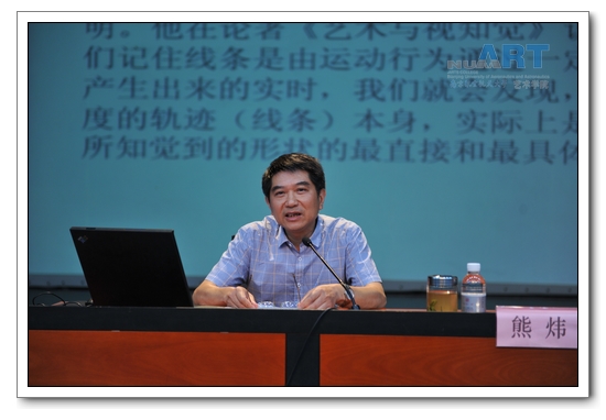 讲座开始,熊老师首先谈到了绘画线条的历史发展,对线条进行了概述。他指出,在绘画中线条的应用范围十分广泛。在墨色体系的绘画中,线条是最主要的造型手段。“墨随笔痕,色依墨态”,是中国画家处理线条、墨彩、色彩主次关系的基本法则。在彩色体系的绘画中,色彩与块面只有用线的外沿,才能有一定的形的存在;色彩与块面不能离开一定的线而单独构成形象。接下来,熊老师对中西画家的线条观进行了比较。熊老师谈到,线条虽然已被人们使用了几万年,但由于各个地域、民族的文化环境不同,画家们对线条的本质,即它的根本性质的看法仍然不一致。西洋画家普遍认为,在绘画中“没有线描”。而中国书法画家则认为:线条首先是书画家自身生命的载体,其次是被描绘的对象的生命载体,最终是宇宙的生命载体。最后,熊老师重点谈到了绘画线条的具象美、抽象美、音乐美以及线条的独立审美价值。