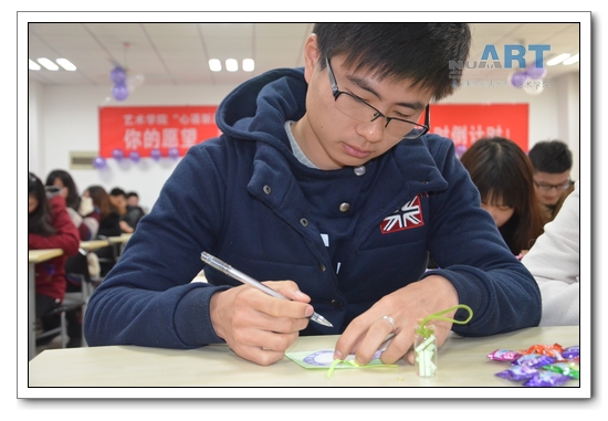 活动现场,同学们都在认真地写下自己新年的第一个愿望,期待着会有什么样的收获。也有同学神秘地表示:“我写了一个‘大炸弹’,希望能坑到我的室友,当然,如果能坑到庞导就再好不过啦!”