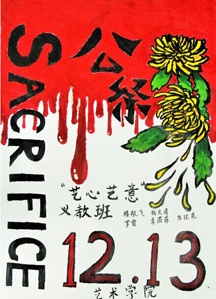 “红旗不倒”、“勿忘国耻,吾辈自强”……这组海报以“铭记历史,勿忘国殇”为主题,通过悼念死难者同胞和展现大屠杀期间的南京两大主题,号召同学们牢记中华民族屈辱与抗争的历史。整组海报以暗色调为主,凸显了红的热烈。“12月13日,是一个让人无法忘怀的日子,我们希望能够利用自己手中的画笔向全校师生诠释我们心中的公祭日,唤起大家心中的爱国之情。”谈到创作初衷,活动负责人刘阳同学说道。