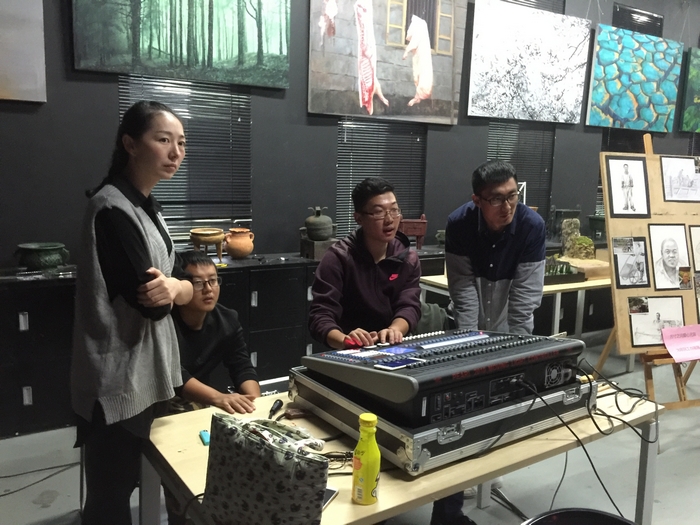 师生们在做舞蹈灯光效果最后调整
