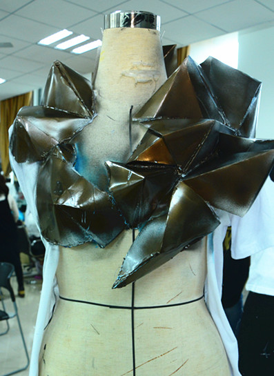 同学们的设计各种各样,有的将中国的剪纸艺术融入其中,有的加入了和风的元素,还有的以硬卡纸为原料制作出具有质感的几何体······付启航同学的作品是一件T恤,他在衣服的正面剪出了人形的镂空,代表着一个人被困在监狱里,衣服的背面是一道划口,代表着窗子,他将服装变成了一个立体的空间,表达了人对自由的向往。