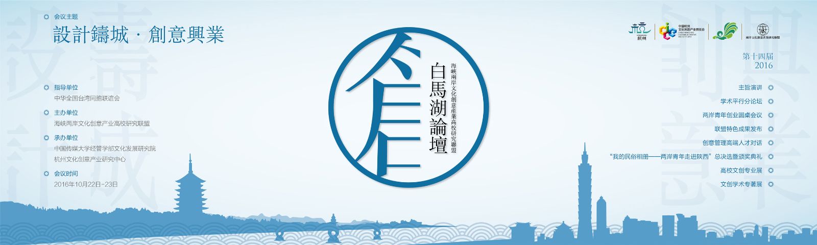 2016年10月22日,第十四届海峡两岸文化创意产业高校研究联盟论坛在杭州白马湖建国饭店召开。本届论坛由中华全国台湾同胞联谊会、中国宋庆龄基金会指导,中国传媒大学文化发展研究院与杭州市文化创意产业研究中心共同承办。多所高校、科研机构、行业协会及文化创意企业的百余位代表参加了此次论坛。 海峡两岸文化创意产业高校研究联盟立足于两岸高校的成人电影