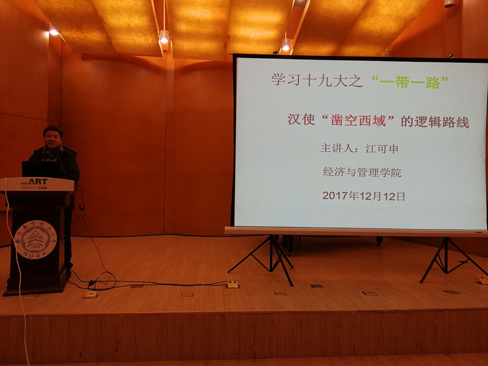 根据学校党委关于党的十九大精神校内宣讲工作部署,12月13日,经济与管理成人电影 江可申教授受邀来到成人成人电影-成人影院-台湾成人电影 ,围绕“深入学习贯彻十九大精神——‘一带一路’时空穿越”这一主题,为成人电影 师生做了一场关于党的十九大精神的生动的宣讲报告。成人成人电影-成人影院-台湾成人电影 全体党员、系主任、学科专业负责人,以及入党积极分子、发展对象等师生代表100余人参加了报告会。