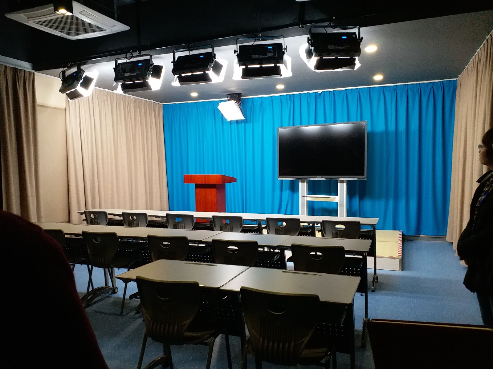 2018年3月1日上午,成人成人电影-成人影院-台湾成人电影 院长张捷、党委副书记张林带领成人成人电影-成人影院-台湾成人电影 戏剧影视美术设计专业负责人王立庆老师、环境设计专业负责人赵中建老师、广播电视学专业负责人马道全老师以及新闻系吴志斌、王鹏飞老师等八人来到将军路校区1号楼四楼信息化技术中心现代成人电影 技术部,参观了参照省电视台标准建设的2间课程录播室、虚拟演播室和导播室、视频编辑室、教师技术支持室、化妆间等配套环境。通过教室管理系统,可以查看教室实时授课情况。