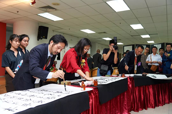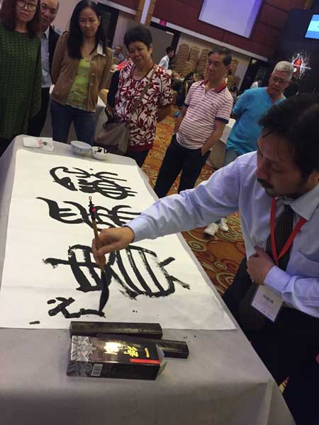 马来西亚总理对华特使陈国伟代表马来西亚政府对到场的各位中国书法博士表示热烈欢迎,并在致辞中说,这么多位中马文艺界嘉宾共聚一堂,一同推进两国文化艺术交流,是两国文艺界的一件盛事。丝绸之路不仅是贸易之路,也是一条文化之路。我们脚下的这片土地,自古以来便是海上丝绸之路的重要节点。东晋的法显大师从陆上丝绸之路经过敦煌到印度取经,再从印度坐船返回中国。据历史学家考证,他还经过马六甲海峡和马来半岛,可算是“一带一路”的先行者。今天,中国国家主席习近平提出“一带一路”倡议,可谓高瞻远瞩。“一带一路”强调“五通”,即:政策沟通、设施联通、贸易畅通、资金融通、民心相通。这其中,最接地气、最根本的当属“民心相通”,这就包含加强人文合作,增进人民互信和文化交流。我们今天共同参与这项文化盛会,就是两国民心相通、共同发扬丝路精神的最佳体现。