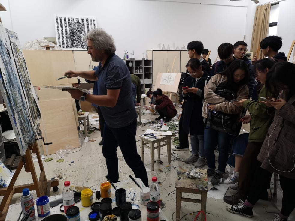 Ridvan Coskun教授主要研究领域是世界历史和风俗遗产研究,他向同学们讲授了土耳其绘画艺术,展示了绘画方面的新材料、新技法、新理念,并现场作画。笔刷蘸着五彩缤纷的颜料粉,在画板上快速绘画,随着色彩的晕染,独特的画面逐渐形成,十分精致细腻。教授所带来的这些富有创意的绘画手法,让成人电影 们大开眼界,收益颇丰。
