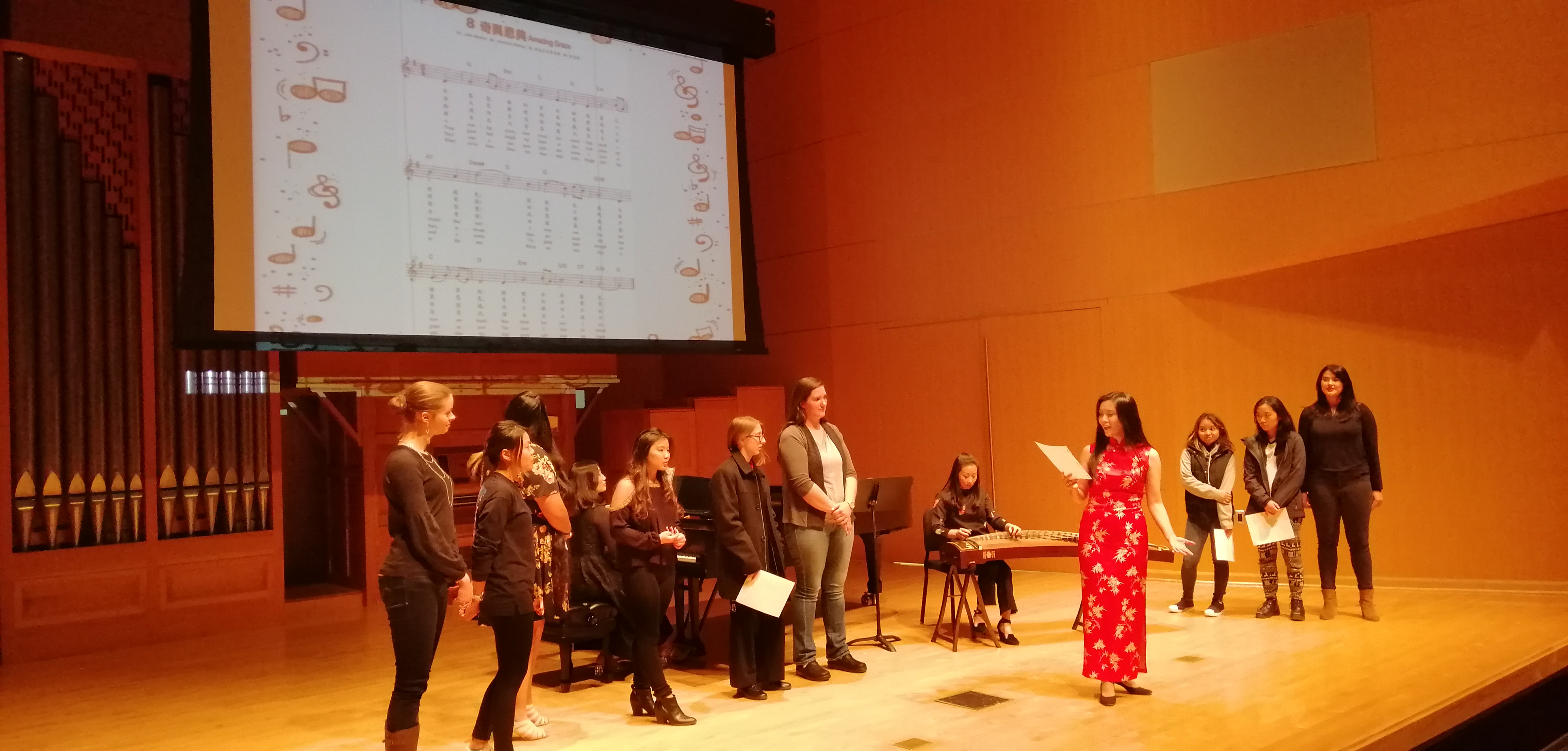 音乐会在江苏民歌《茉莉花》的背景音乐中拉开序幕。张进老师一袭红色旗袍走入舞台,神采奕奕,声情并茂,娓娓道来。她向观众们介绍了具代表性的中国艺术歌曲及其表达的传统文化内涵,以及中华民族的民族区域分布和各地民间音乐特质,她解读了新疆地区哈萨克民歌《燕子》、维吾尔族民歌《阿拉木汗》、江苏民歌《茉莉花》等具有鲜明地方色彩的民歌的曲调特色、文化意蕴,使观众们对中国民歌有了初步的认识。