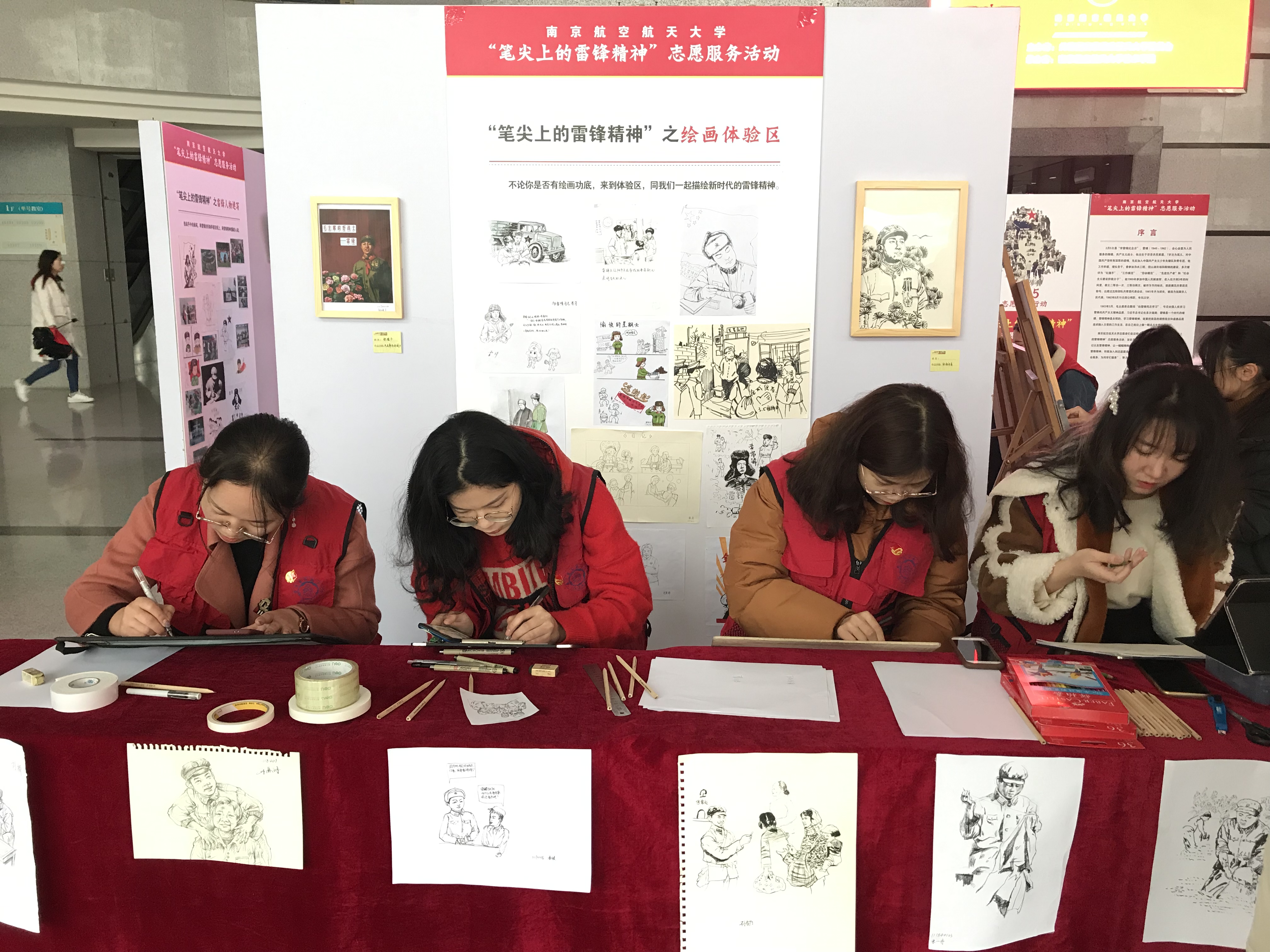 3月5日清晨,在成人成人电影-成人影院-台湾成人电影 江宁校区主楼大厅,身穿红色小马甲的成人电影 坐在画板前,用手中的画笔专注地勾勒雷锋的形象,讲解员对着展板上的画作,向参观者讲述雷锋同志的感人故事。由校团委主办,成人成人电影-成人影院-台湾成人电影 承办的“笔尖上的雷锋精神”志愿服务活动,旨在发挥专业所长通过手绘的方式描绘雷锋日记以及雷锋精神,让一幅幅栩栩如生的画面引导跟多的同学了解雷锋、了解雷锋精神、积极加入到志愿服务团队,积小善为大善,努力展现新时代青年志愿者们的崭新风尚。