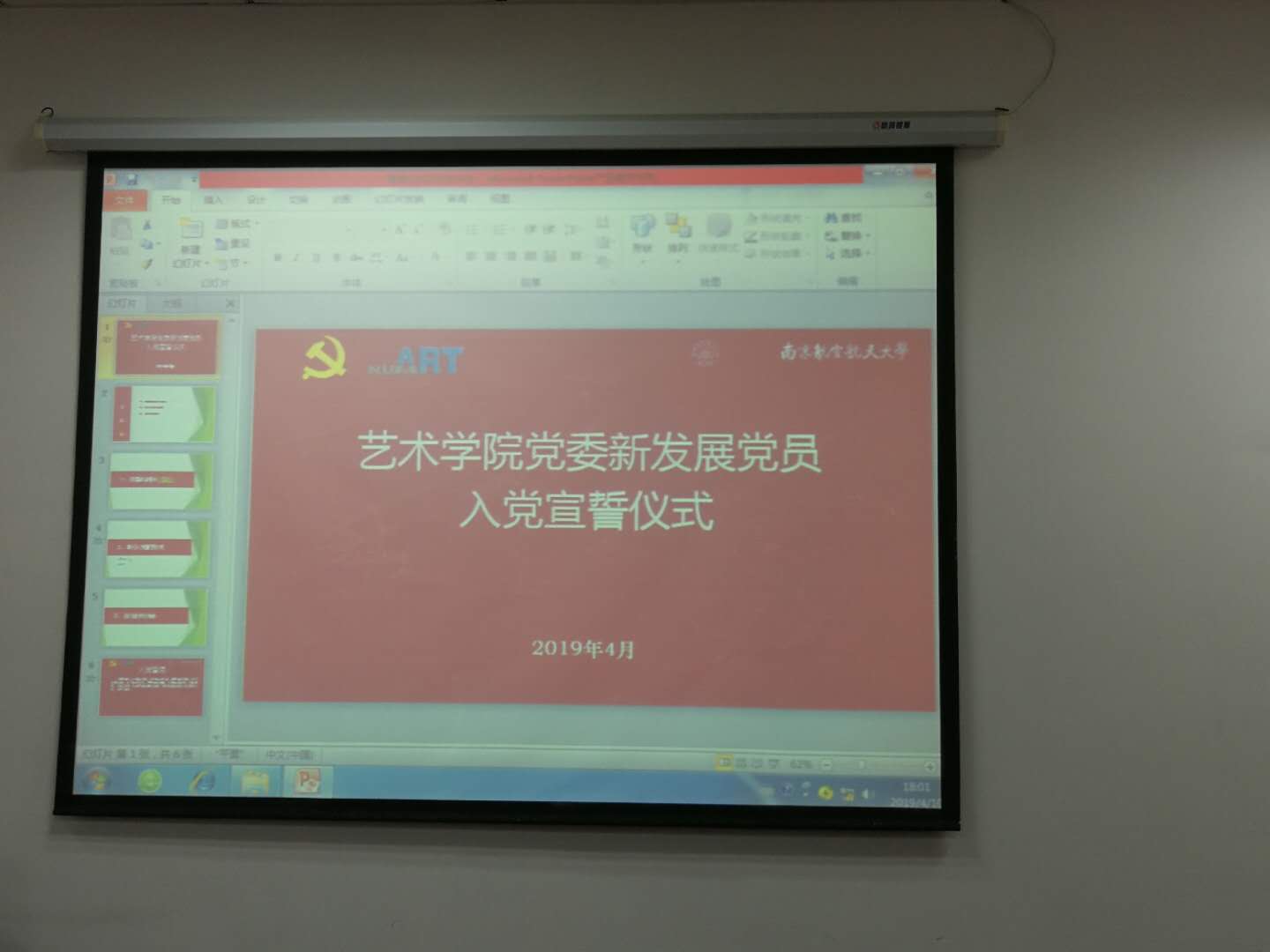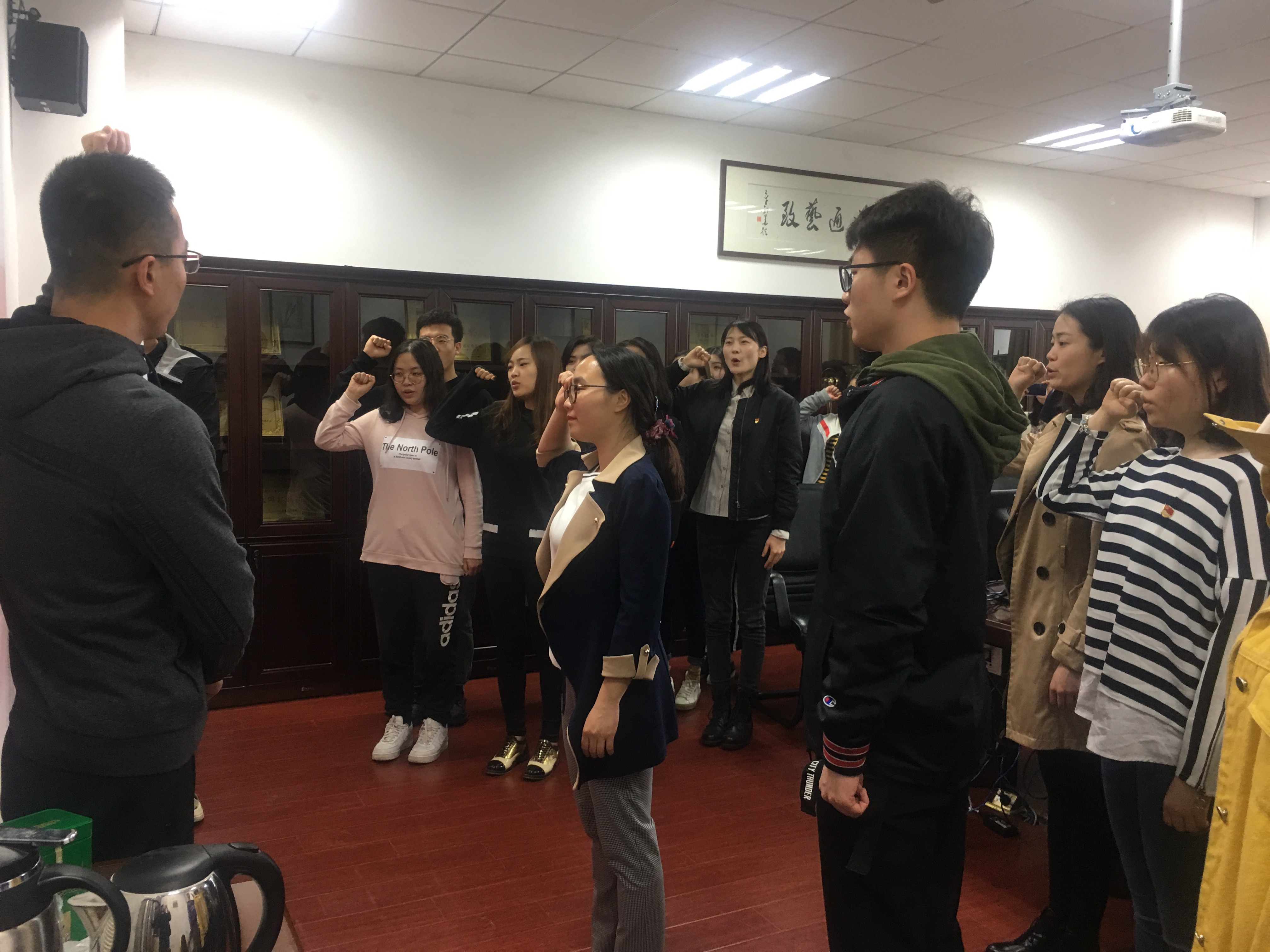 与会师生首先共同观看了宣誓成人电影 短片《看齐》,并为习近平总书记等党和国家领导人庄严的宣誓仪式所深深感染。接着,全体成员起立共同唱响了《国际歌》,2018年度新发展的党员同志从孙老师手中接过党徽,并由支部书记、正式党员为其戴上了党徽,整个过程严谨、严肃,充满仪式感。全体新发展党员在领誓人孙吟吟老师的带领之下,面向党旗,举起右拳,进行庄严宣誓:“我志愿加入中国共产党,拥护党的纲领,遵守党的章程,履行党员义务,执行党的决定,严守党的纪律,保守党的秘密,对党忠诚,积极工作,为共产主义奋斗终身,随时准备为党和人民牺牲一切,永不叛党。”