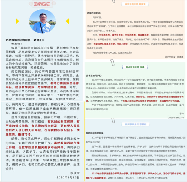“虽然教学活动在线上开展,但教学质量及相关要求不会降低。请同学们按时上课,认真学习,也请老师们严格执行考勤制度,尽可能以多种平台交互的方式顺利推进教学活动。期待疫情早日结束,尽早恢复正常的教学与生活。祝同学们、老师们及你们的家人健康吉祥,生活愉快!”23日,成人电影 院长板俊荣通过成人电影 官微向师生们做了鼓舞人心的新学期致辞,系主任路漫漫、李伟、蔡雁彬老师也都寄语成人电影 ,希望同学们停课不停学,宅家不放松,尽快调整好作息时间,认真按照课表参加线上学习,按时完成作业和练习,精神饱满地投入到新的学习征程。