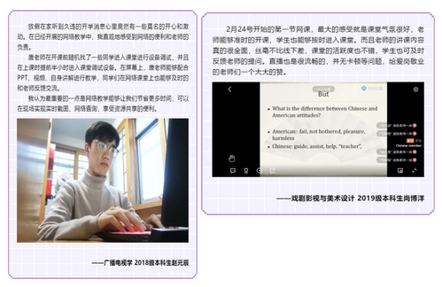 课程结束后,老师们纷纷写下在线教学的体会,从这些珍贵的教学手记中,我们可以读出老师们认真备课,潜心教学和精心育人的初心。许多老师认为,尽管当前疫情给我们的教学工作带来了些许困难与不便,但网络教学也提供了一种新的教学方式和手段,一定程度上也倒逼成人电影