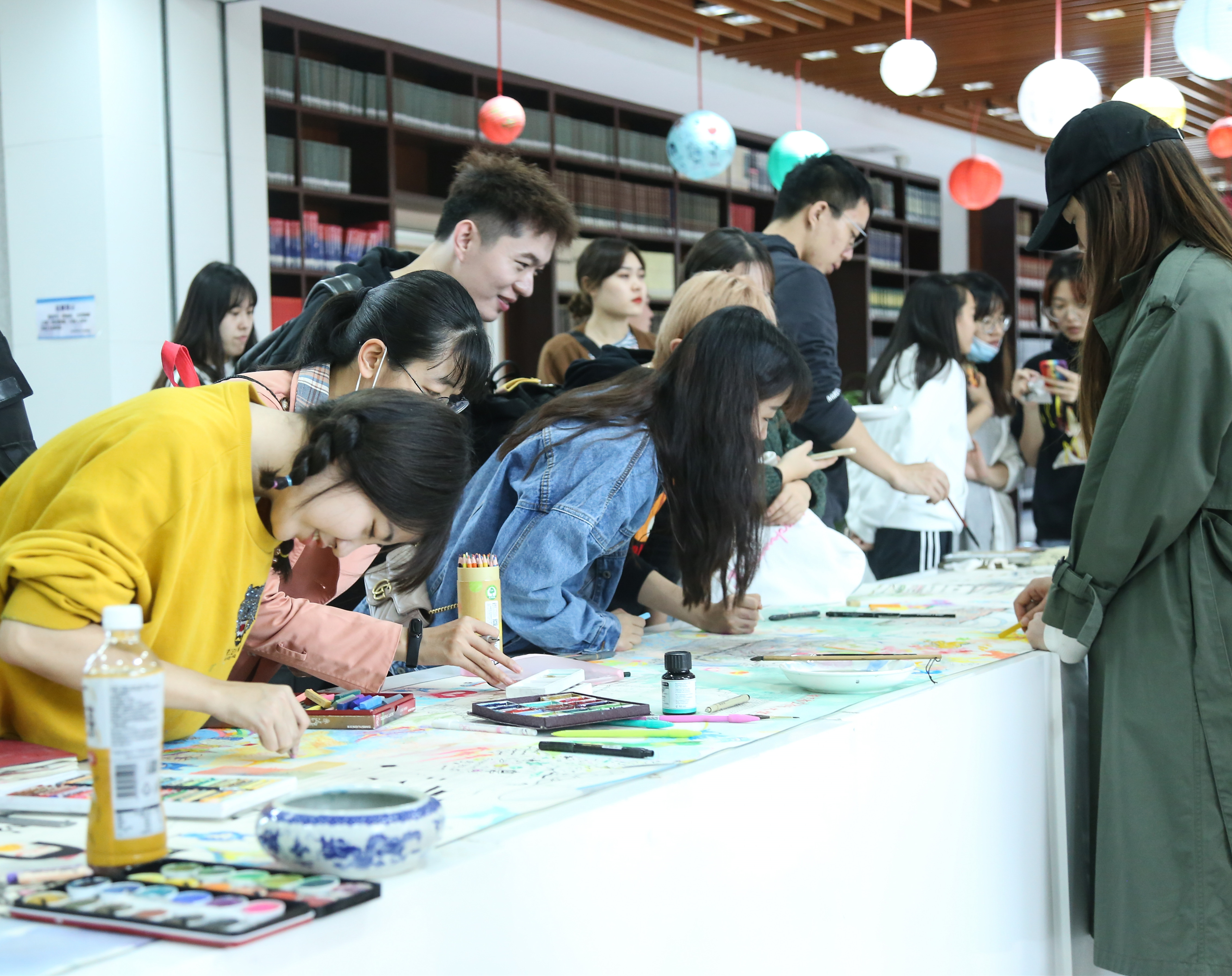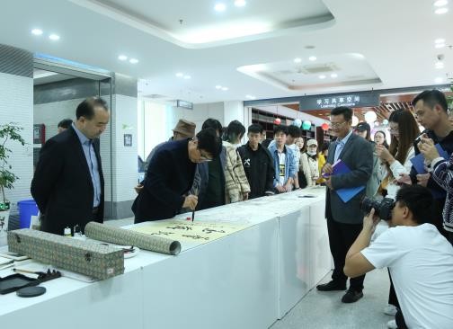 在专业老师的指导下,现场同学们兴致盎然,共同执笔,绘制十米长卷,描绘南航历史、校园风景、南航人风采,章剑华为画卷题字,共同表达对学校的深情厚谊。