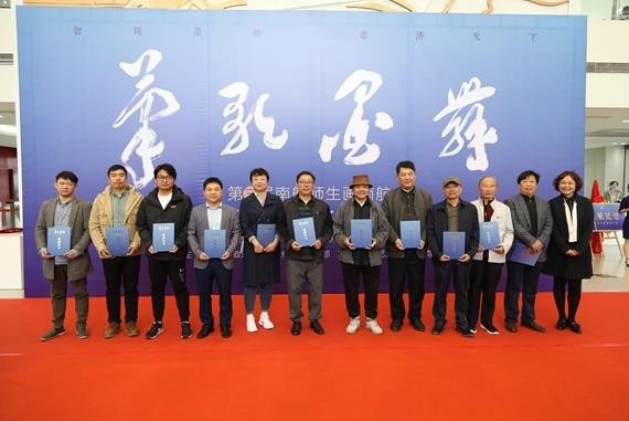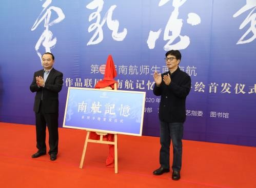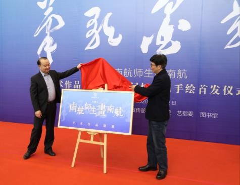 章剑华和陶勇共同为“笔歌墨舞”第三届南航师生画南航艺术作品联展和南航记忆手绘首发仪式揭牌
