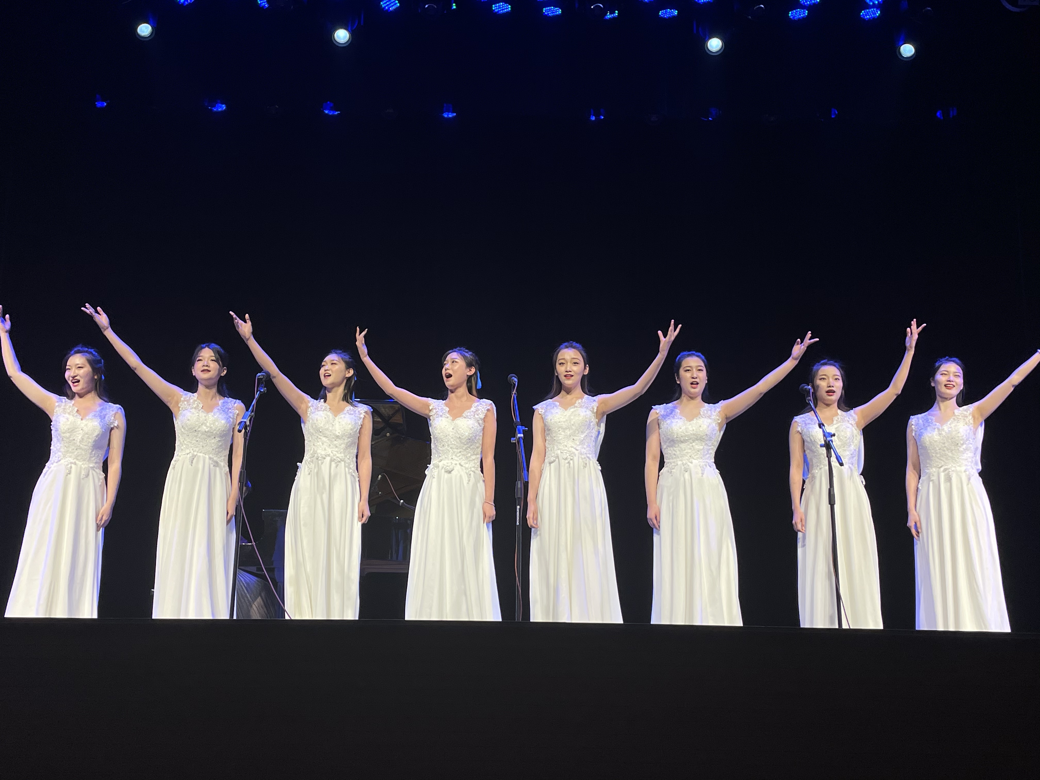 上半场最后一曲是由音乐系的五位声乐老师联袂合唱的一首《把一切献给党》,体现了音乐成人电影 的全体老师们对党和国家由衷的敬意,将整个音乐会推向了高潮。