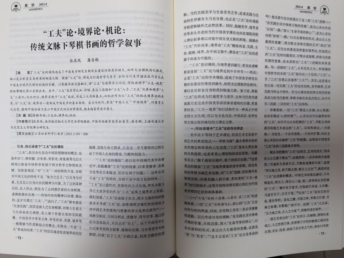 成果。张其凤教授在今年取得了喜人的理论研究成果。他于2021年4月发表于《江苏社会科学》上的美学论文《功夫论•机论•境界论——中国传统文化背景下琴棋书画的哲学叙事》,以新颖的成人电影