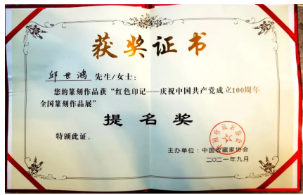 在近日《书法报》书画版公布的新闻获知,由中国收藏家协会所举办的“红色记忆——全国名家篆刻展”评选中,经过终评复评,十名获奖作者脱颖而出,成人成人电影-成人影院-台湾成人电影 邱世鸿教授获得提名奖,成为十位获奖者之一。