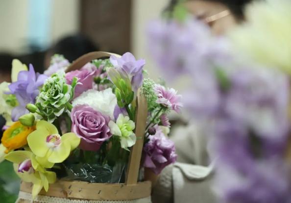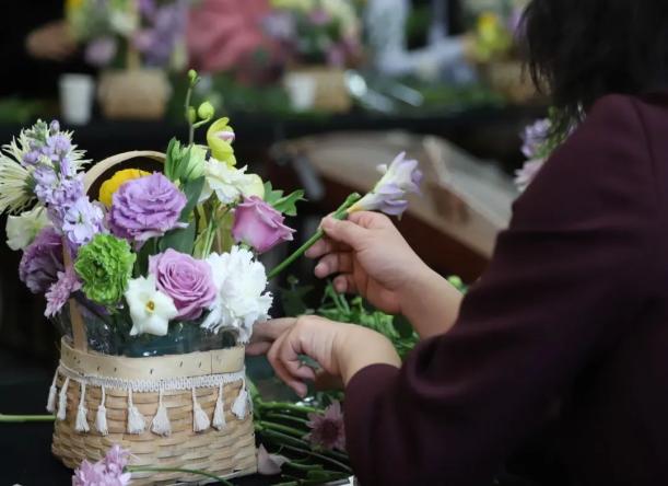 在初步学习了花艺知识后,老师们充分发挥自己的想象力和创造力,将波斯菊、蝴蝶兰、康乃馨、洋桔梗等各色花卉修剪整理,搭配在一起。