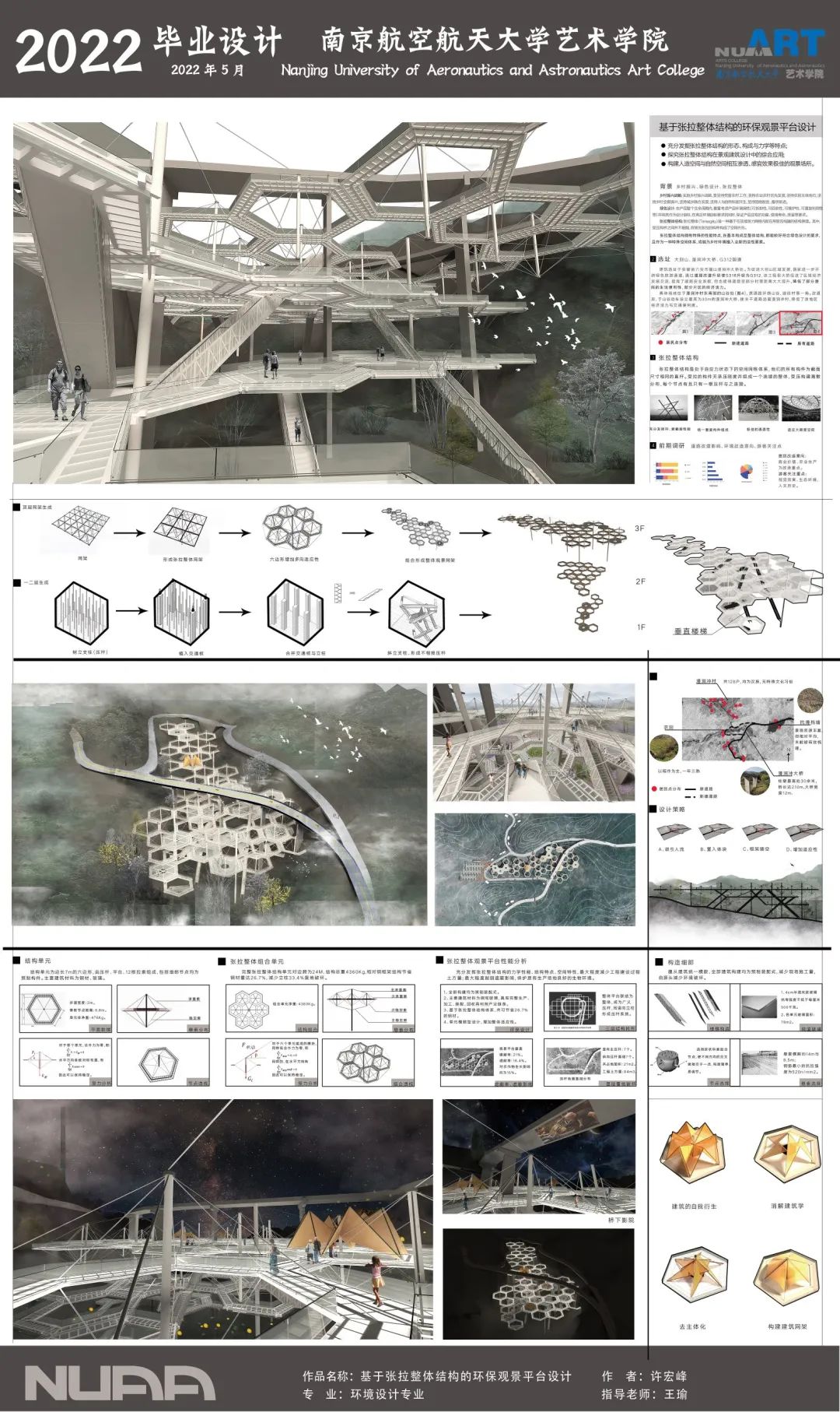本设计旨在探究张拉整体结构在绿色建筑实践中多维利用的可行性。基于张拉整体结构原理,以帕斯拉网架为结构原型,形成全新张拉整体结构单元。依据以上单元的各特点建造:环保绿色、兼顾产业、空间效果极佳的观景平台。