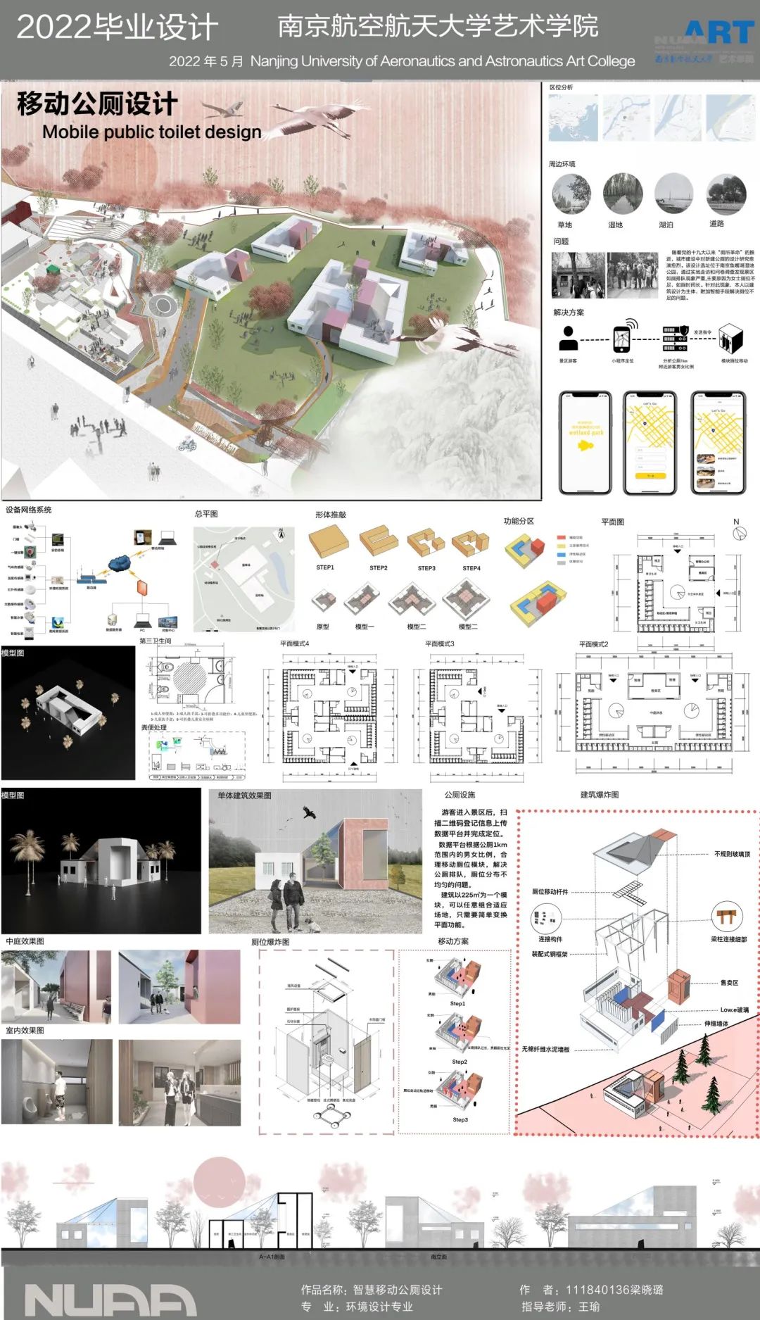 作品位于南京市鱼嘴湿地公园,经过调查研究发现公厕中男女厕位分布不均的问题,设计以建筑设计为主体,解决男女厕位分配问题为切入点,将智慧化技术与建筑融合。建筑以225平方米为原型,可以根据场地进行扩建,符合现代快速建造,多样化的设计需求。