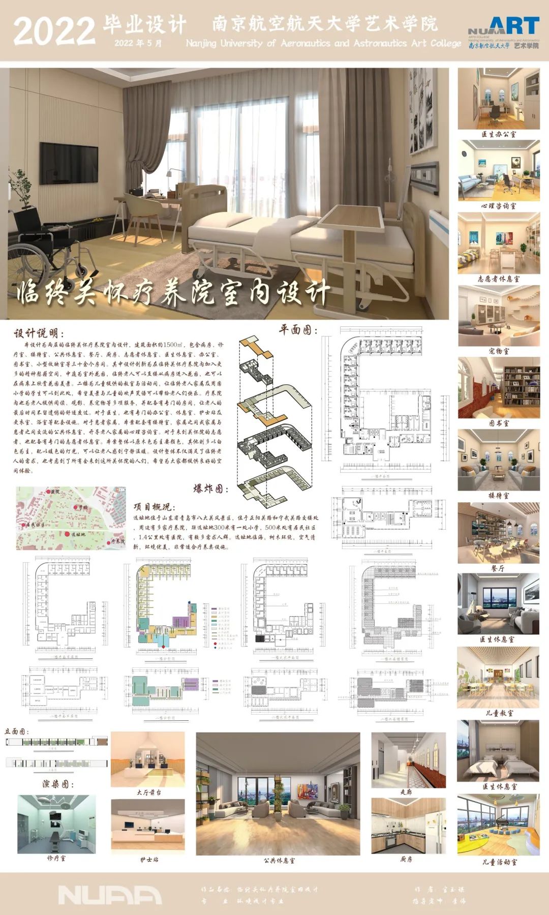 本设计为两层的临终关怀疗养院室内设计,建筑面积约1500平方米,包含病房、诊疗室、接待室、公告休息室、餐厅、厨房、志愿者休息室、办公室、图书室、小型放映室等三十余个房间。其中设计创新为在临终关怀疗养院内加入更多的精神慰藉空间,中庭为室外花园,临终老人家属及周围小学的成人电影 可以到此处,希望美景与儿童提供的欢声笑语可以带给老人们快乐。