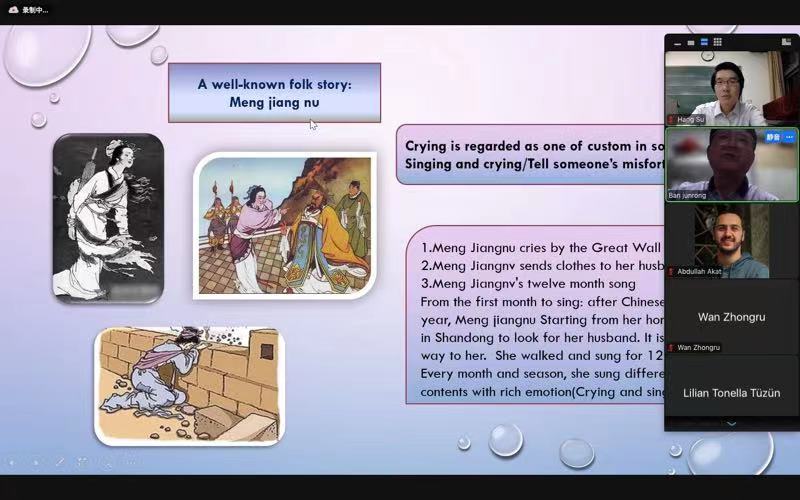 研讨会上,板俊荣主要介绍了“四季体”和“月令体”中国民歌中反映气候变化的相关内容,并结合分节歌《孟姜女十二月歌》中曲调随唱词内容的不同而变化,民间歌者也往往会随着月令之变在音色的驾驭上呈现出丰富的表现内涵。苏航在发言中详细介绍了舒伯特声乐套曲《冬之旅》中曲调、织体及其他音乐元素随气候变化而呈现的丰富样态,他还现场示范了较多段落的演唱与伴奏,结合视听同感转换阐释了作曲家的每个创作细节。两位老师的演讲深得与会专家的认同,组委会将会议视频在线下会场多次播放。