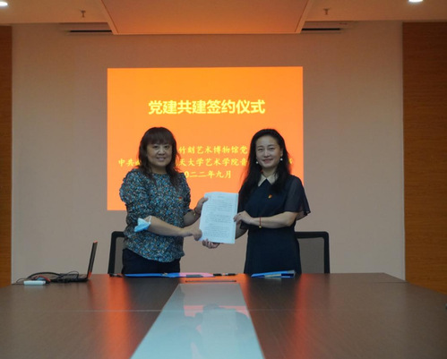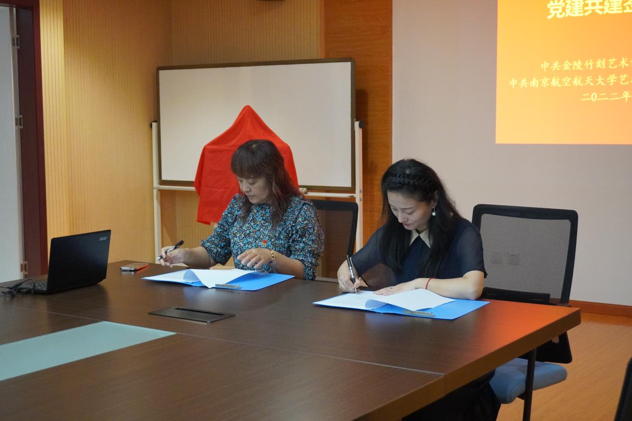 音乐系党支部书记汪晓露和金陵竹刻艺术博物馆党支部书记任丽丽共同签署党建共建协议。
