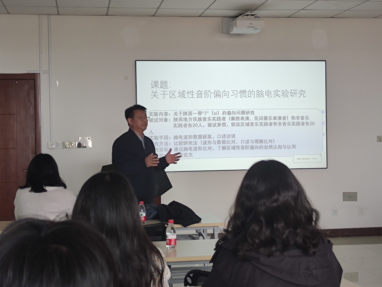 选题会上,板俊荣老师提出了“关于区域性音阶偏向习惯的脑电实验研究”的选题意向,就脑电波形对听觉认知的数据支撑做了初步阐述。张道强教授该脑电实验的设想予以肯定,并计划组建学科交叉组,进一步研讨目标达成和设计实验方案。