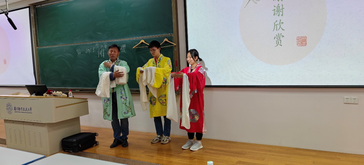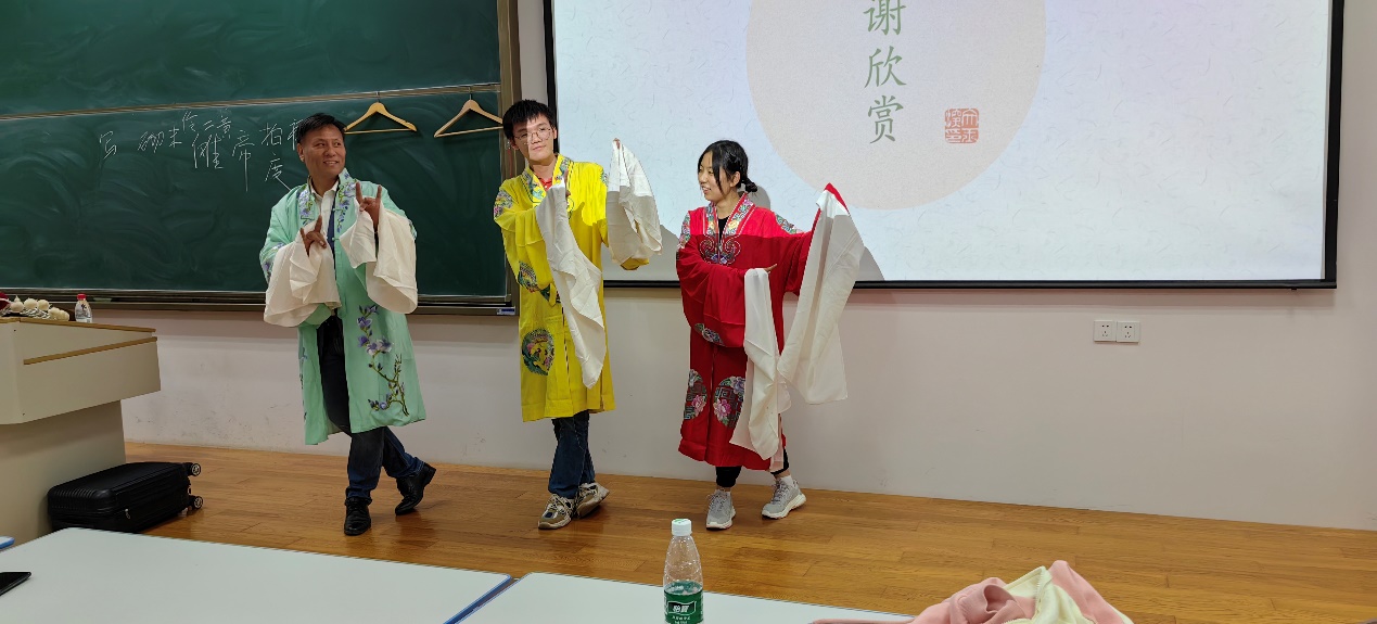 讲座。他分别讲述了戏曲艺术中唱作念打的基本内涵,介绍了化妆艺术、戏曲服饰及妆扮之美,并将各种表演与声腔、韵白紧密结合。最后,彭老师为同学们展示了戏曲中白蛇的头部装束,介绍了旦角服饰中的“水袖”技巧,同学们参与热情极高。