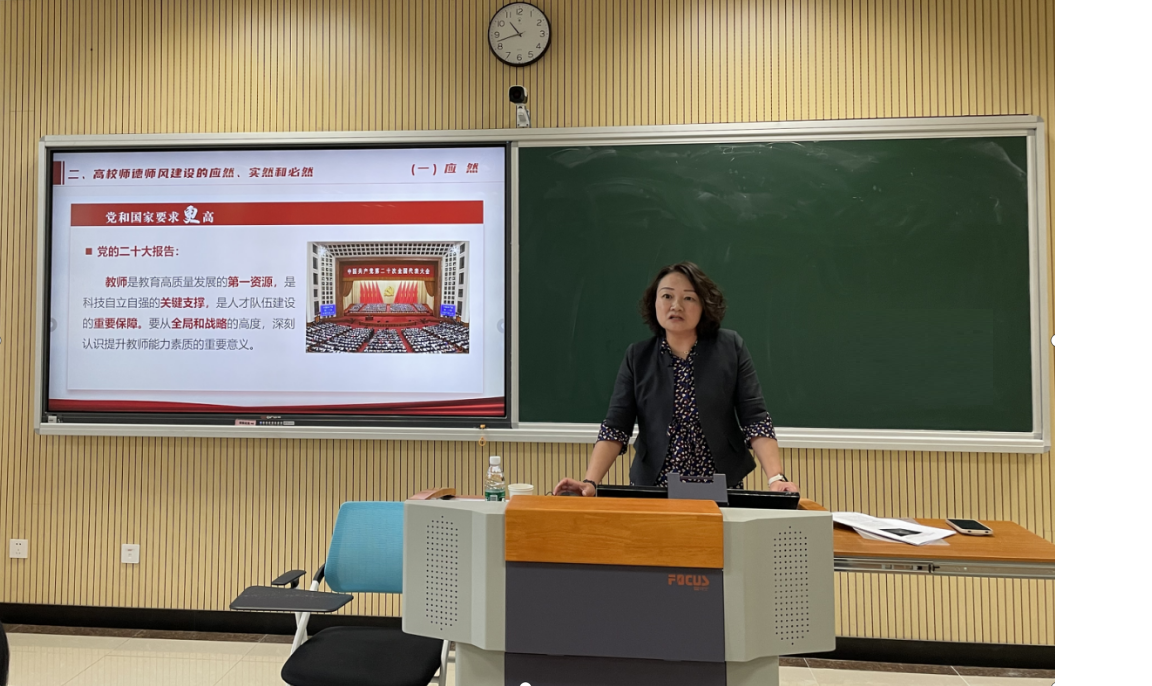 王晖以“我在南航当老师”为题,引导教师们认真思考作为一名南航的老师,身上所承担的使命和责任。她从相关舆情事件说起,指出高校师德师风建设的应然、实然和必然。她带领大家共同学习了习近平总书记关于高校教师队伍建设和文艺工作的重要论述。从宏观、微观两个层面阐述了师德师风建设面临的形势和任务,分析了我校教师队伍建设的现状,引领教师重新学习了《新时代高校教师职业行为十项准则》《成人电影 导师指导行为准则》等规定,并通过列举警示案例,加深了教师们对政策的理解。强调要“热爱”和“敬畏”大学老师这份光荣的职业,坚定立德树人、铸魂育人的职业理想,严守师德师风底线,大力弘扬成人电影 家精神。