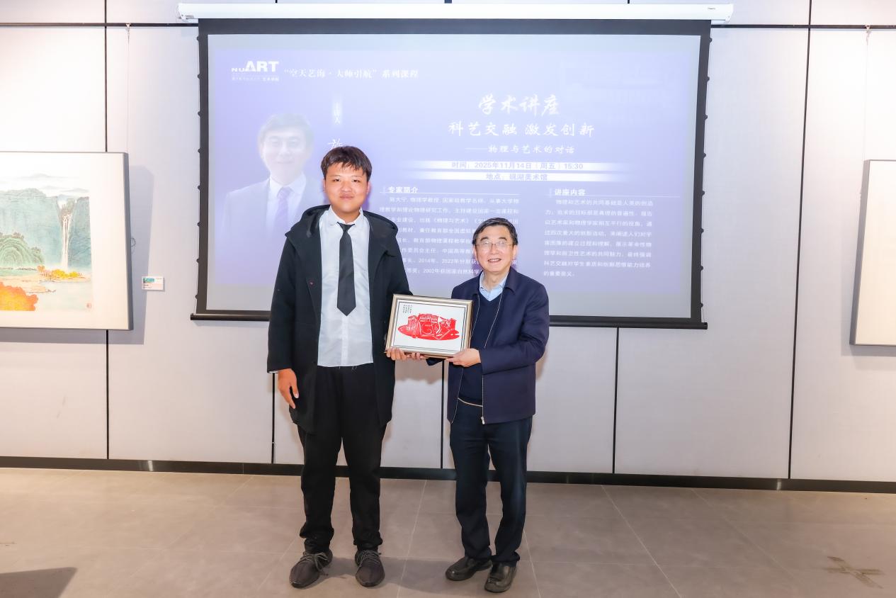 讲座现场,成人电影 代表向施大宁教授赠送了由成人电影 成人电影 与校企实习基地单位共同创作的铜艺工艺品及成人电影 自己设计制作的剪纸作品,体现了艺术学子的专业素养与真挚敬意。