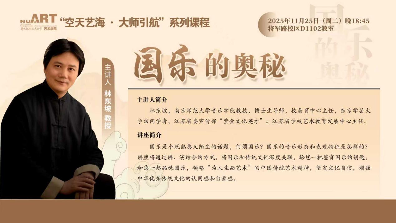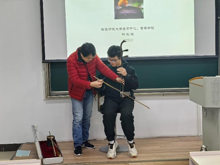 “国乐不仅是艺术形式,更是中华文明的精神载体。”11月25日晚,南京师范大学美育中心主任、音乐成人电影 林东坡教授做客我校,为百余名学子带来一场别开生面的美育讲座《国乐的奥秘》。这不仅是知识的讲解,更是一场沉浸式的国乐体验,当天还有个别同学参与了现场互动,随林教授学习了二胡的基本演奏技巧。