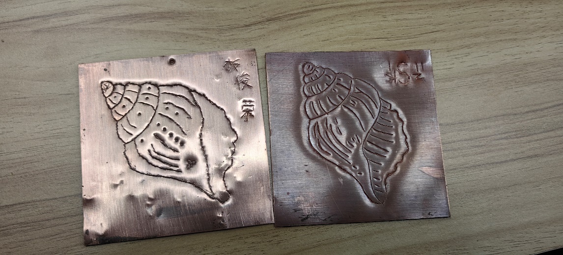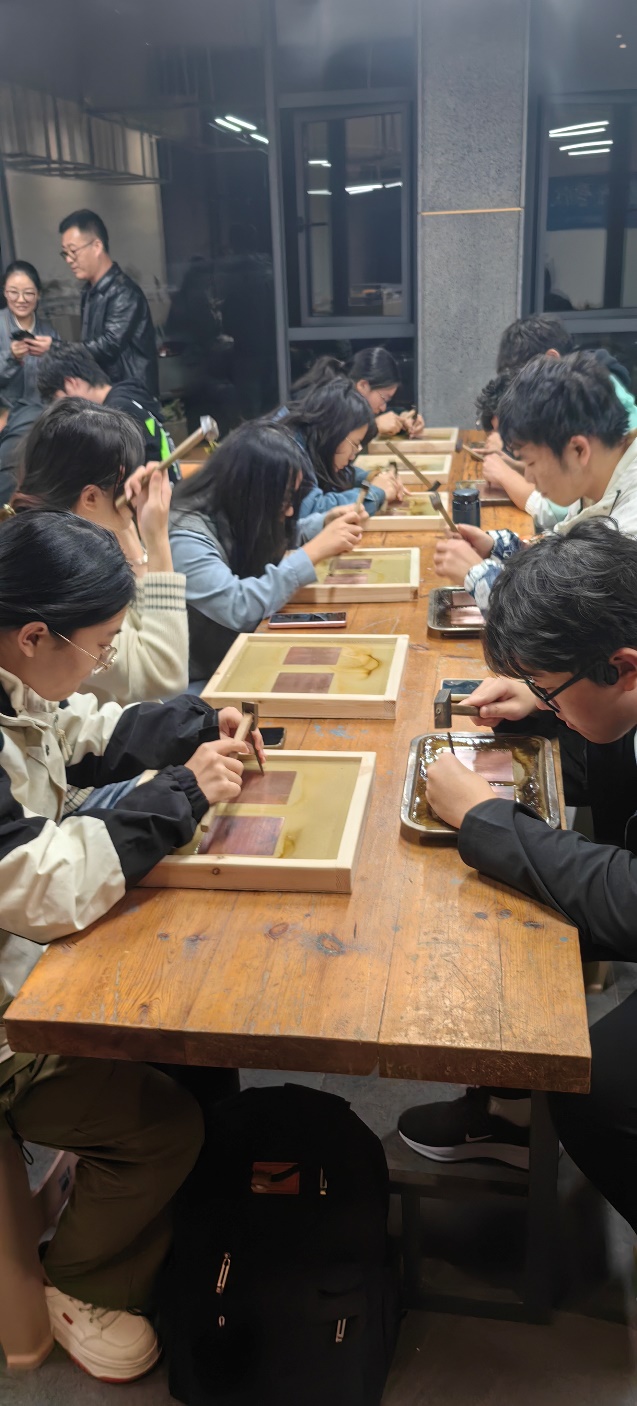 在参观完展品后,最让人兴奋的环节是亲手实践。若说观摩是跨时空的交流,那么动手制作一幅铜版雕画则是对于技艺实实在在的磨练了。我们的任务是对一张已经画好图案的小铜片进行敲打和雕琢,使其轮廓逐渐呈现凹凸的效果。一走入这间工作室,同学们制作铜艺作品的敲打声响成一片,极似雨打芭蕉声,那是先行实践小组的同学们正在聚精会神地精耕着自己的作品。回头一看,我们的老师也在拿着小锤子正在敲打着,心想,等会得跟他一比高下,看看谁的作品更有创意。