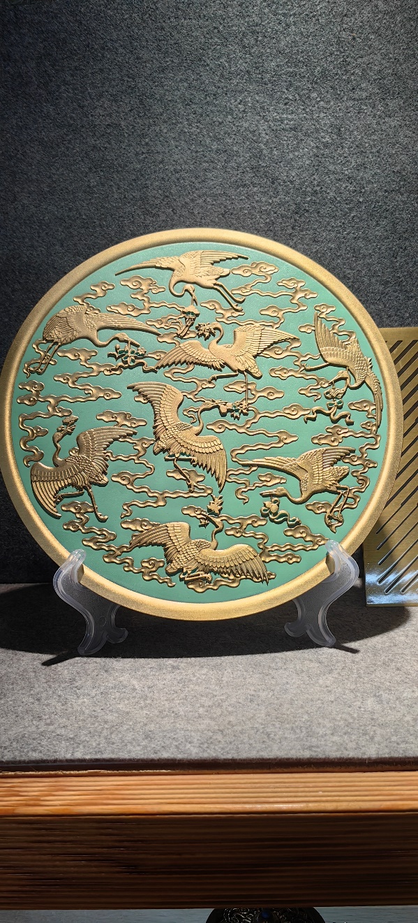 我们踏上三楼,各种铜艺作品散落在木质展柜上,我一眼注意到其排列,谈不上紧凑,但也不像博物馆一样由一个个玻璃柜仔细分割并呈设,而是处于一种恰到好处的松弛而又丰富的状态。正如讲解员所说:“这里的很多作品是雅俗共赏的。”漫步其中,我发现有很多铜艺作品的题材贴近当时、当地百姓的生活,如稻田里的毛蟹、黄豆丛、茂密的竹林等,有的色调单纯,有的则着色大胆鲜艳。尤其是在几件比较抽象的艺术作品中,非深入体会则不见其精妙。“雅俗共赏”一词看似包含两个相互对立的成分,像是油与水不相交融,但真正见到这样的艺术作品时,我才意识到,艺术之美不是简单的非黑即白的,更像是水乳交融,而圆融之美正藏在这一幅幅铜画中。在薄薄的铜板上做出凹凸不平的,栩栩如生的橙色金鱼,形状各异的竹笋。每一件作品都蕴含着无比精妙的技艺,而大部分题材又贴近人们的日常生活,即使是一位没有受过系统艺术训练的人也可以从其趣味性和精致地构图上体验到奇巧之处。