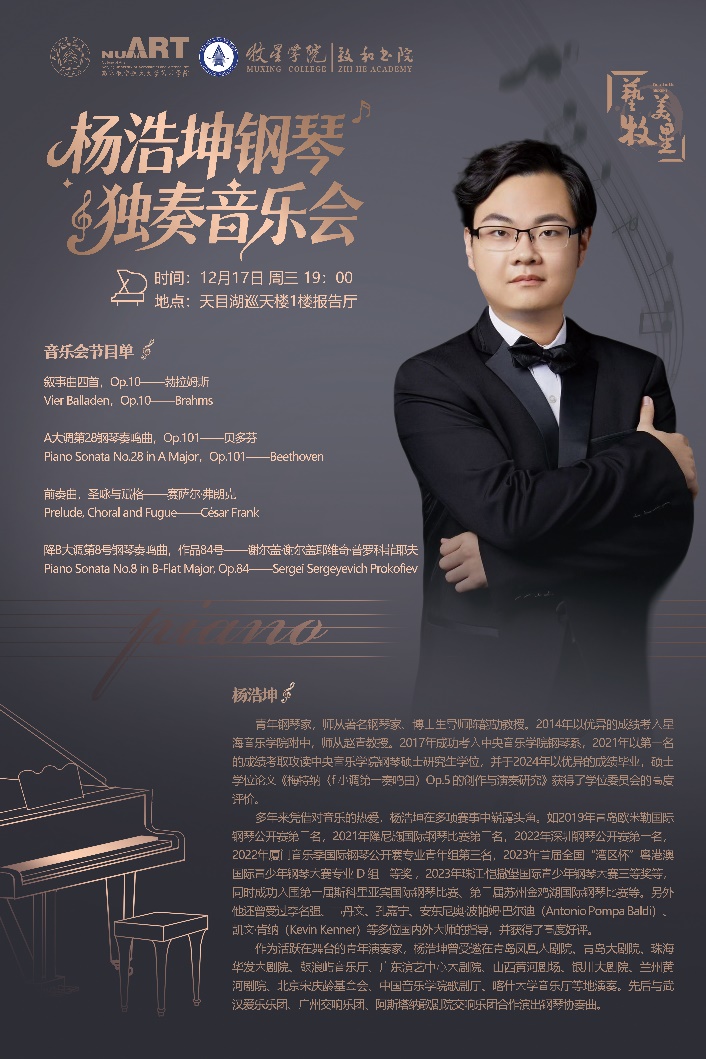 12月17日,一场高水平钢琴艺术盛宴在我校天目湖校区巡天楼报告厅奏响。青年钢琴演奏家杨浩坤钢琴独奏音乐会吸引了全校师生与校外音乐爱好者到场聆听,现场座无虚席,气氛热烈。